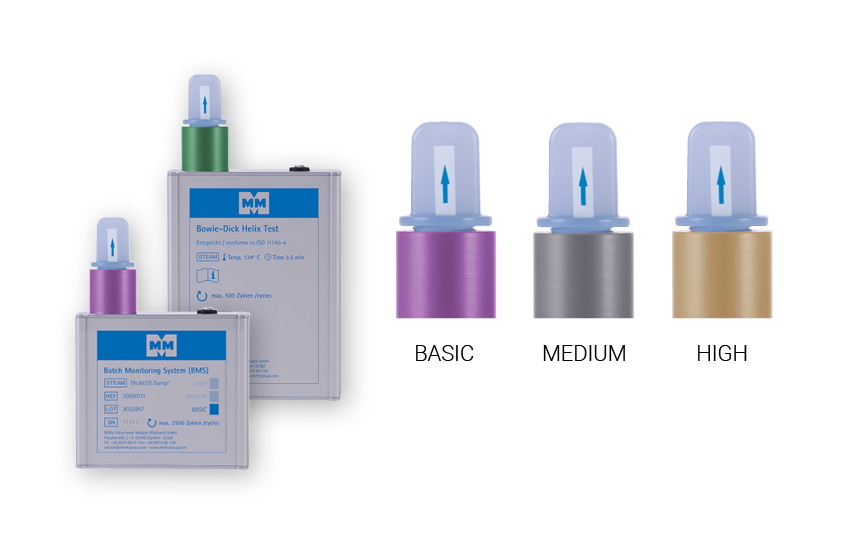 Das MMM Batch Monitoring System – geprüft nach den Vorgaben der DIN EN ISO 11140-6 – wurde speziell für die Zykluskontrolle der APPcycles® entwickelt. Die Prüfkörper wurden exakt an die APPcycles®-Prozesse angepasst. Sie stellen analog zu unterschiedlich komplexen Medizinprodukten unterschiedliche Anforderungen an den Prozess.